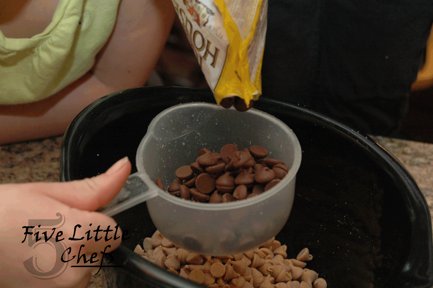 The second time through the recipe (remember our bowl isn’t big enough to stir a whole batch) it was much quicker. Little Chef A knew what she was doing. She was moving around with confidence from one task to the next. She practiced stirring even faster to try to help melt the chips.