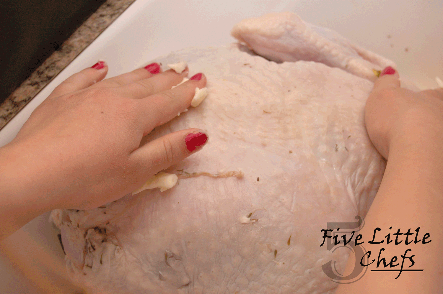 Little Chef a covered the outside of the turkey with pats of butter. She was ok getting her hands all greasy this time and did not complain.