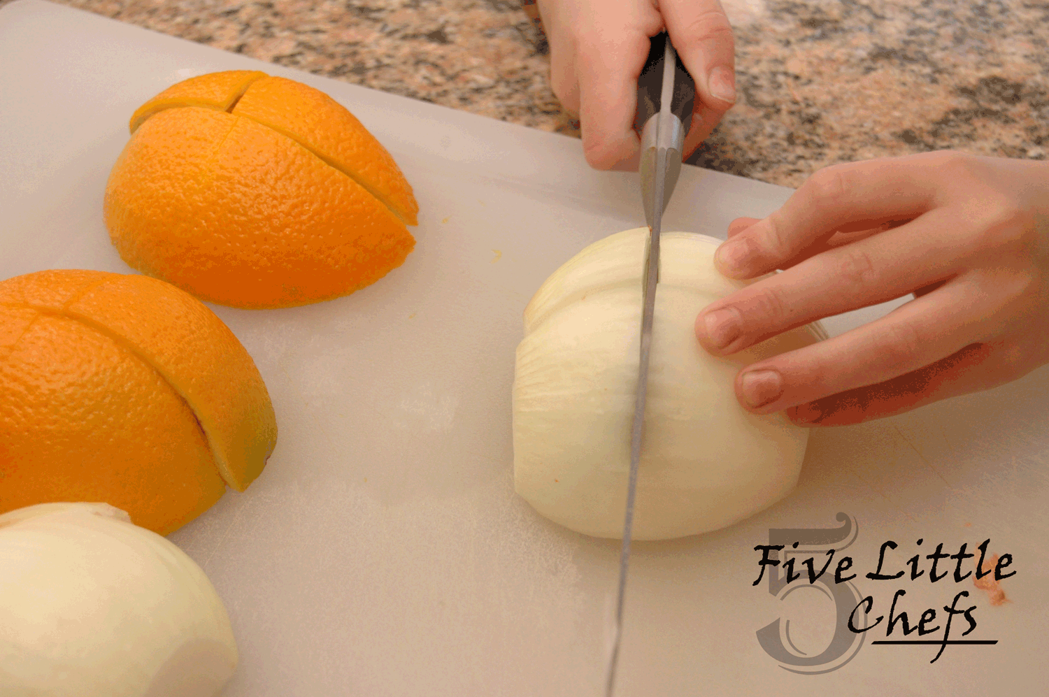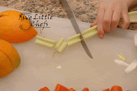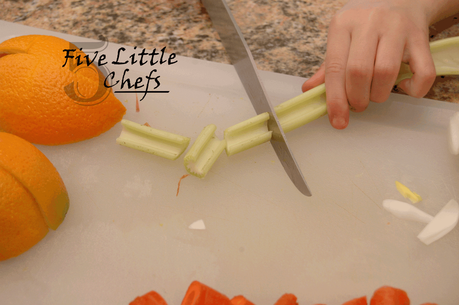 Little Chef C cut the orange and onion in 8ths. She did it the night before so she knew exactly how to do it, just one additional cut. She also cut the celery and the carrot in one inch pieces.